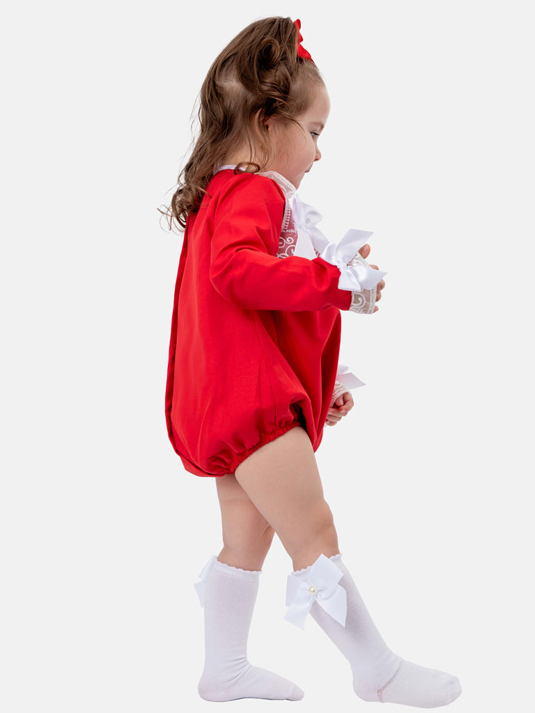 Product includes: Spanish-style romper with white lace and satin bow details.