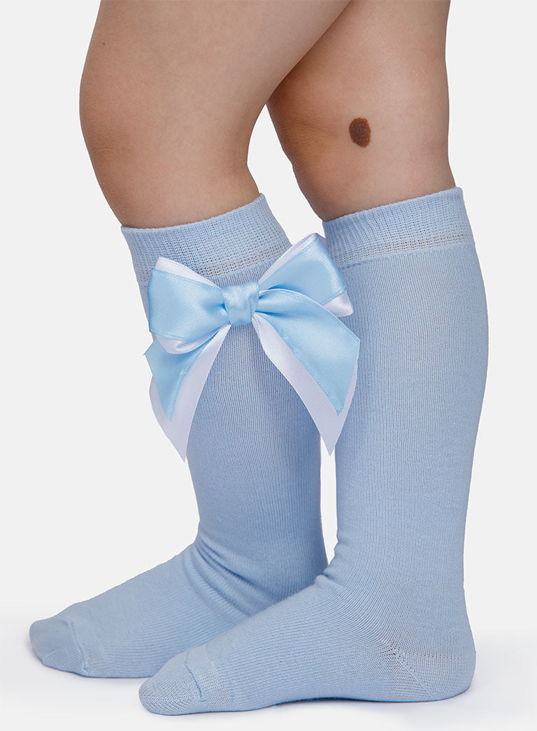 Baby Girl Knee Socks with Satin Double Bow - Baby Blue & White