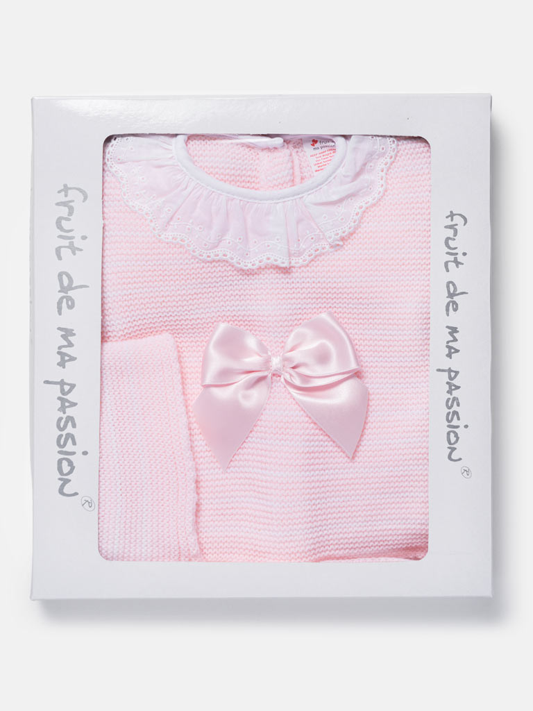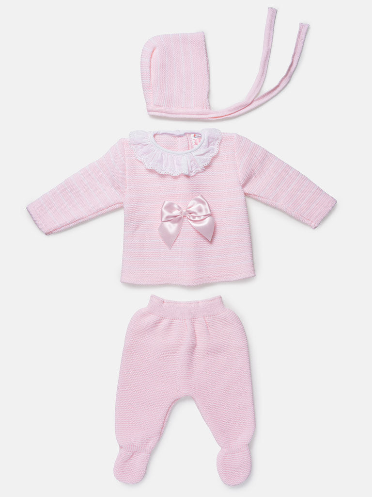 Product includes: Knitted Sweater with white collar and Satin Bow + Knitted Pants with Enclosed Feet + Knitted Bonnet